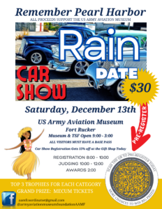 In observance of the 84th anniversary of the attacks at Pearl Harbor, join us for a TSF Open House and Car Show! Plan to spend the day enjoying all the festivities – Chili Cook-Off, Door Prizes, Costume Contest & More! Register Your Car by Nov 16 to get a FREE exclusive T-shirt & a chance to win more prizes! Click HERE to register NOW. Please note that All Visitors MUST have a military ID or stop by the Visitors Center in advance to get a pass. Click the link for more info: https://home.army.mil/rucker/visit